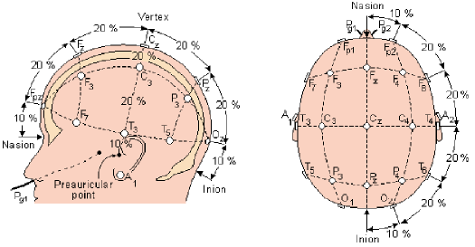 10-20系統(tǒng)電極放置法是國際腦電圖學(xué)會(huì)規(guī)定的標(biāo)準(zhǔn)電極放置法。額極中點(diǎn)至鼻根的距離和枕點(diǎn)至枕外粗隆的距離各占此連線全長(zhǎng)的10%,其余各點(diǎn)均以此連線全長(zhǎng)的20%相隔,如下圖所示。因此命名為10-20系統(tǒng)。“10”和“20”指的是相鄰電極之間的實(shí)際距離是頭骨前后或左右總距離的10% 或20% 。注奇數(shù)表示大腦左側(cè),偶數(shù)表示大腦右側(cè)。左右側(cè)各取8個(gè)電極,加上前后位上的額中點(diǎn)(Fz)、中央點(diǎn)(Cz)、頂點(diǎn)(Pz)以及兩個(gè)耳電極共21個(gè)電極。如下圖所示