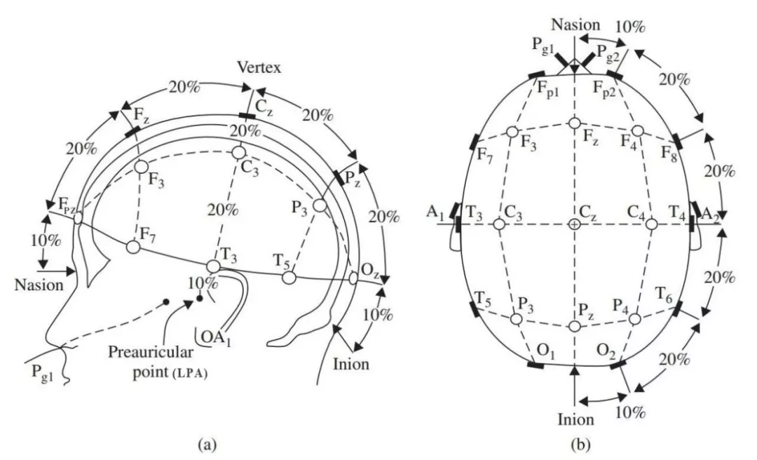 從鼻根(Nasion)至枕外隆凸(Inion)的取一連線,在此線上,由前至后標(biāo)出5個(gè)點(diǎn),依次命名為:額極中點(diǎn)(Fpz )、額中點(diǎn)(Fz)、中央點(diǎn)(Cz)、頂點(diǎn)(Pz)、枕點(diǎn)(Oz)。額極中點(diǎn)至鼻根的距離和枕點(diǎn)至枕外粗隆的距離各占此連線全長(zhǎng)的10%,其余各點(diǎn)均以此連線全長(zhǎng)的20%相隔。